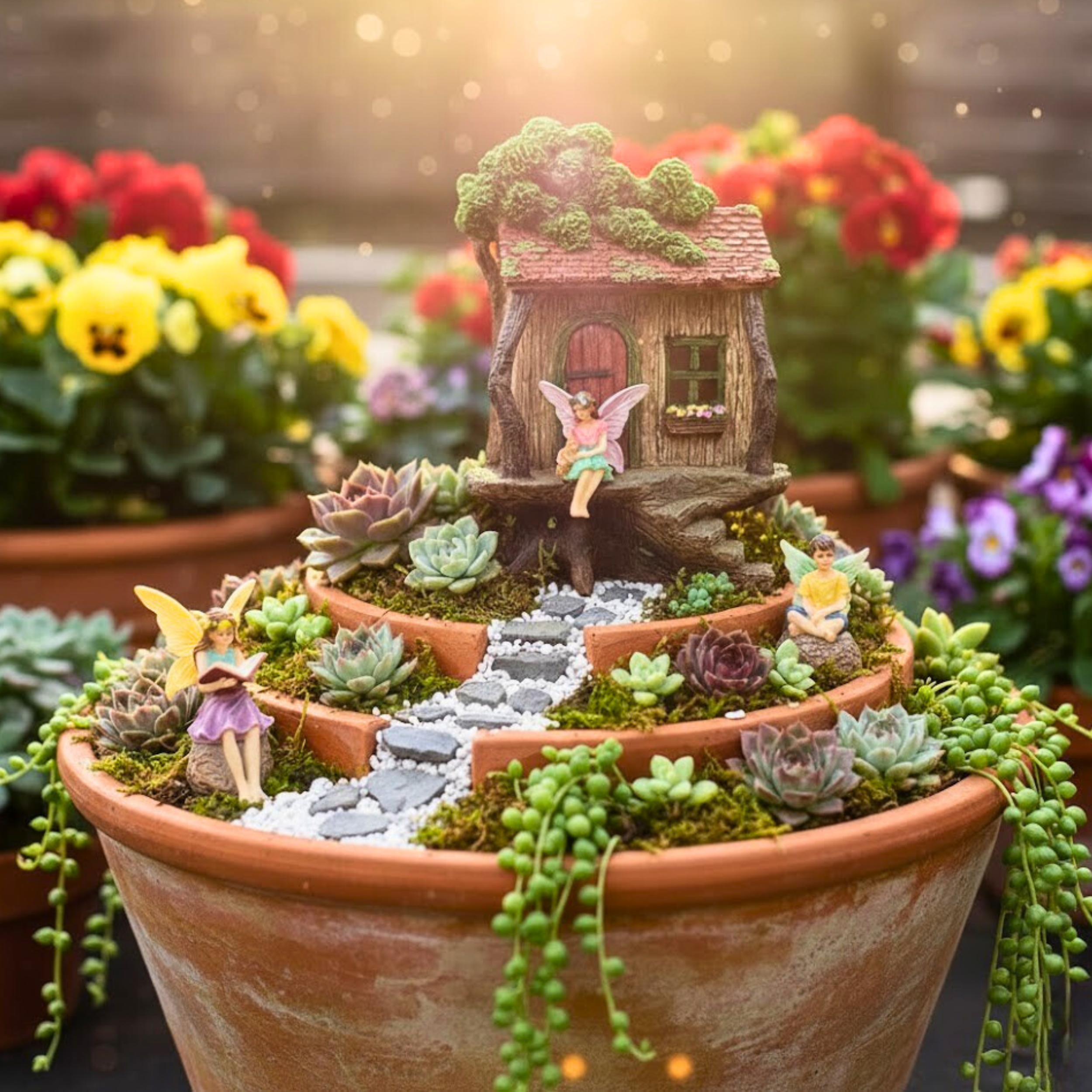 • 🧚♂️ The Sitting Boy Fairy: A charmingly relaxed figure, perfect for perching on the treehouse porch or garden floor.