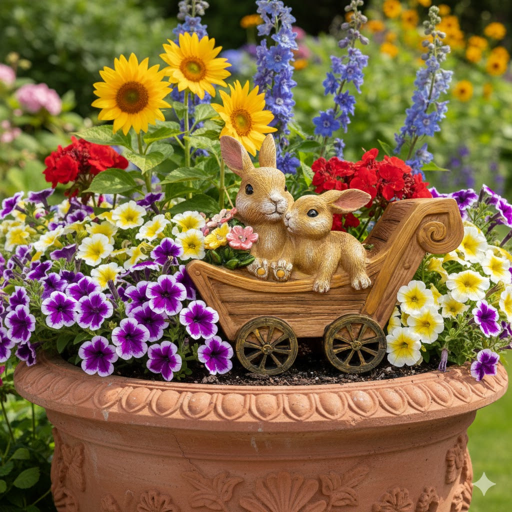 Add a heartwarming glow to your outdoor sanctuary with this artistically crafted solar-powered statue. Featuring a tender moment between a mother and her baby bunny in a rustic wooden-style cart, this piece automatically illuminates at dusk, casting a warm, enchanting light across your patio, garden bed, or pathway.
